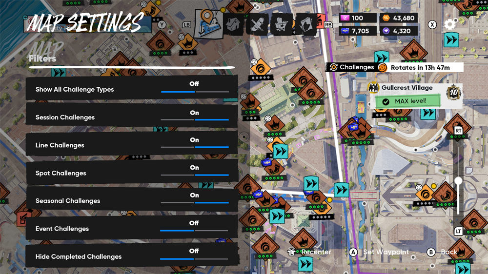 There are a lot of challenges in-game which is great, but the map can be overwhelming and visually crowded for some players. Filters would allow for players to easily choose which ones are shown or hidden from view. The first image above, displays all challenges. 'All Challenge Types' is toggled 'on' and 'Hide Completed Challenges' is turned 'off'. When all challenges are shown, the additional options are greyed-out.